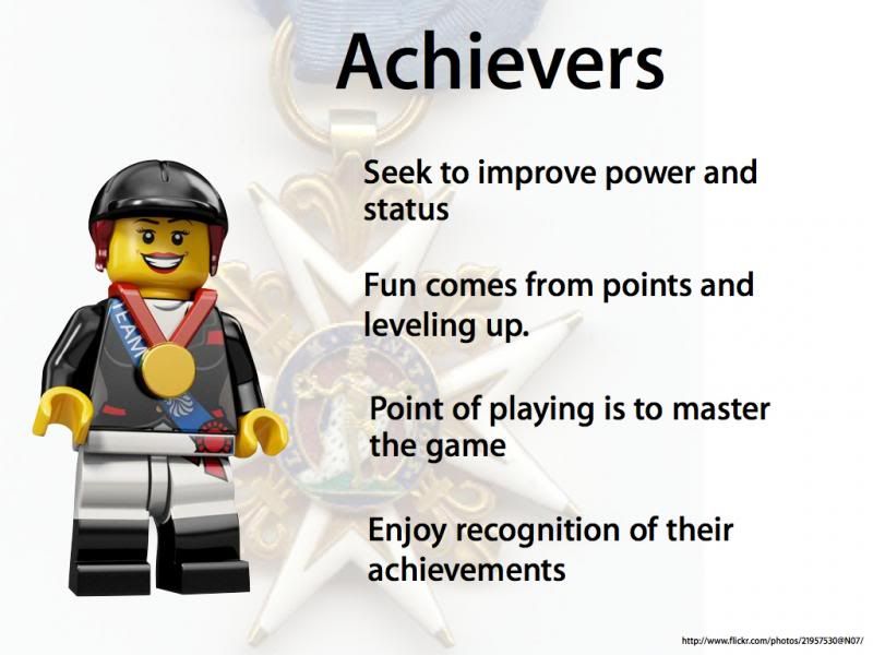 Achievers are interested in ACTING on the WORLD.  They are typical gamers, playing to "win".  They give themselves game-related goals, and vigorously set out to achieve them.