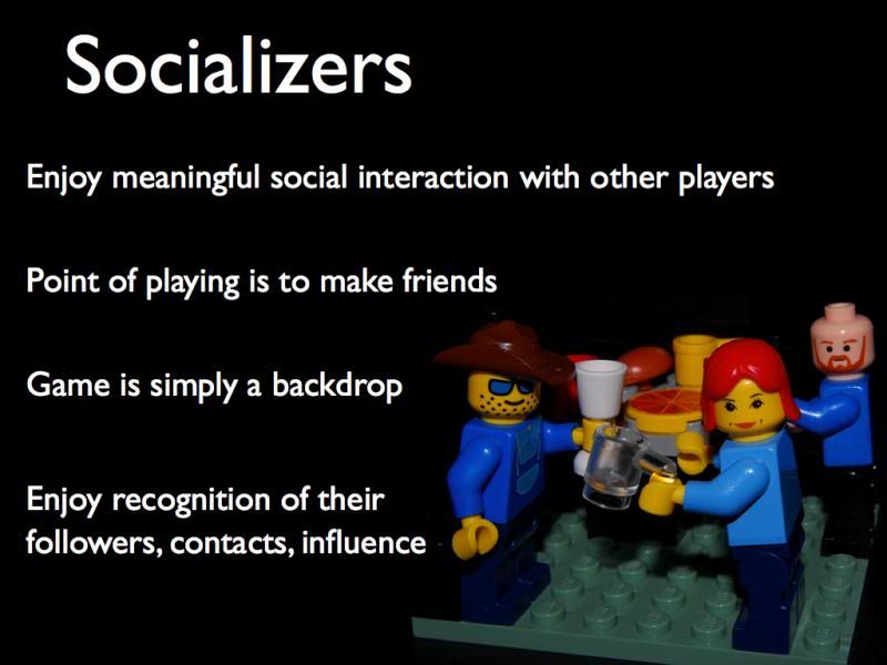Socializers are interested in INTERACTING with other PLAYERS.  They spend a lot of time chatting, and empathize with other players.